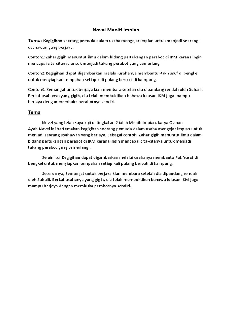 MENITI IMPIAN Osman Ayob TEMA Tema novel Meniti Impian ialah keazaman dan kegigihan seorang remaja berusaha mengejar impian dan cita-citanya untuk menjadi seorang usahawan yang berjaya.